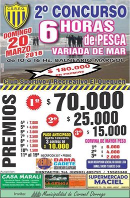 2º Concurso 6 horas de pesca Variada de Mar en Marisol,el día 20 de Marzo de 10 horas a 16 horas organiza Club Sportivo y Recreativo El Quequén ,Anticipadas hasta el 14 de marzo...los esperamos,valor general 550 damas y cadetes 450 pesos